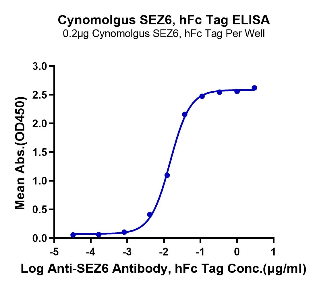 Immobilized Cynomolgus SEZ6, His Tag at 2ug/ml (100ul/Well) on the plate. Dose response curve for Anti-SEZ6 Antibody, hFc Tag with the EC50 of 14.9ng/ml determined by ELISA. See testing image for detail.