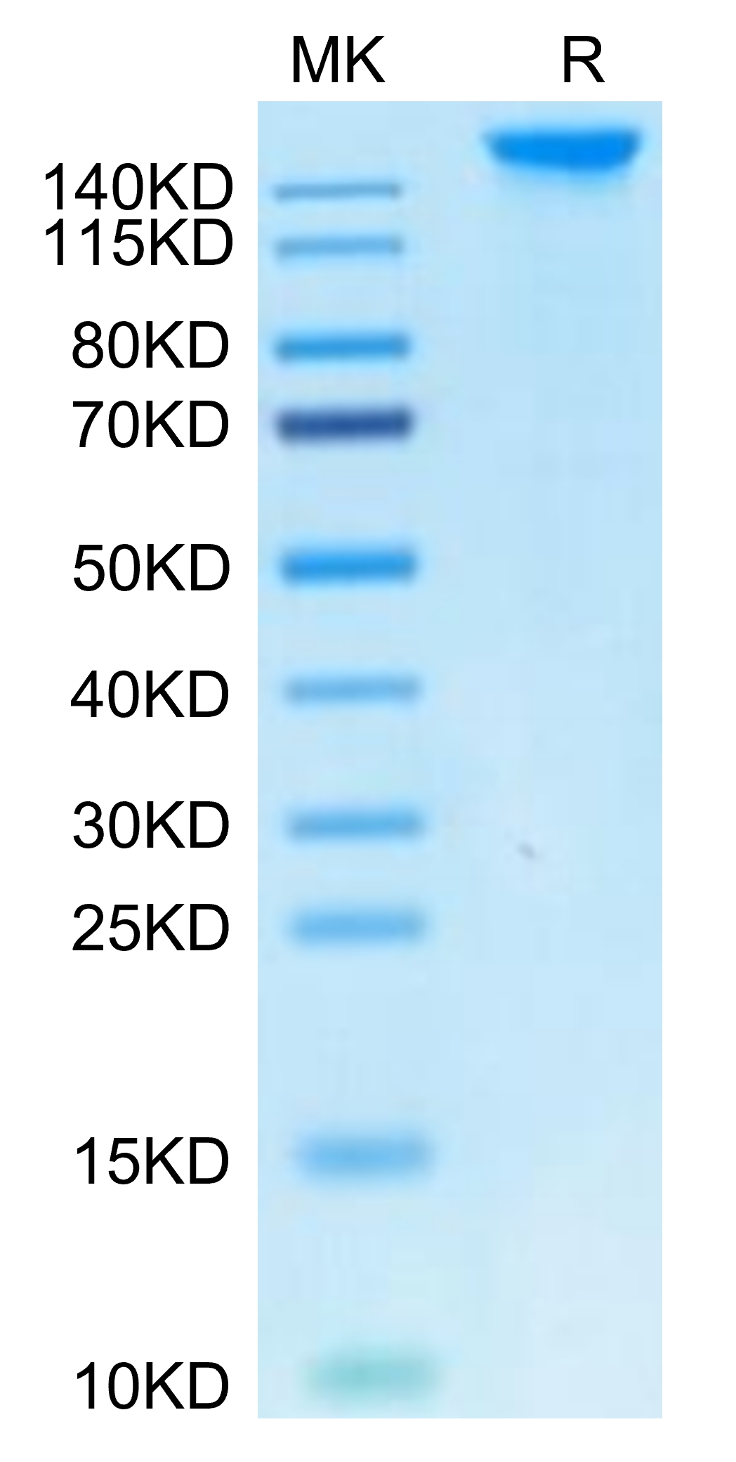 The protein has a predicted MW of 99.11 kDa. Due to glycosylation, the protein migrates to 150-180 kDa based on Tris-Bis PAGE result.