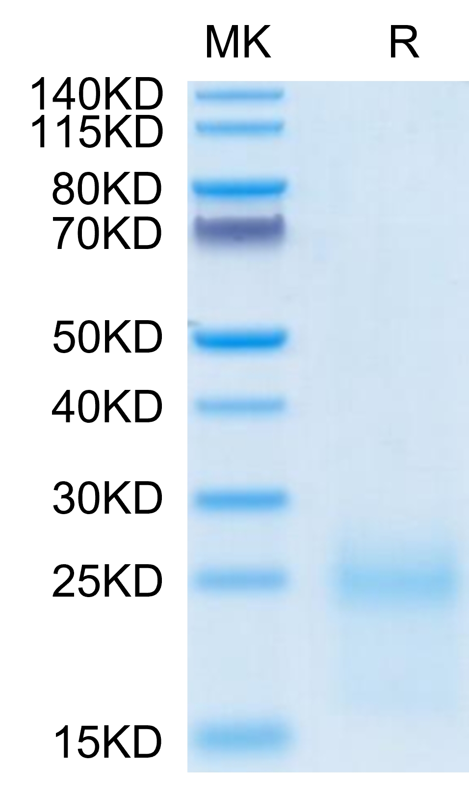 The protein has a predicted MW of 16.3 kDa. Due to glycosylation, the protein migrates to 23-26 kDa based on Tris-Bis PAGE result.