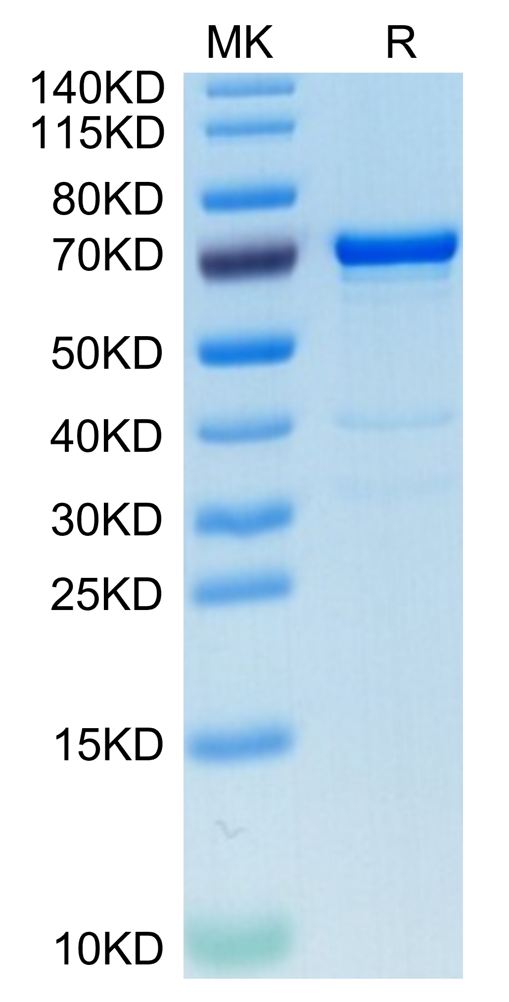 The protein has a predicted MW of 67.6 kDa. Due to glycosylation, the protein migrates to 68-72 kDa based on Tris-Bis PAGE result.