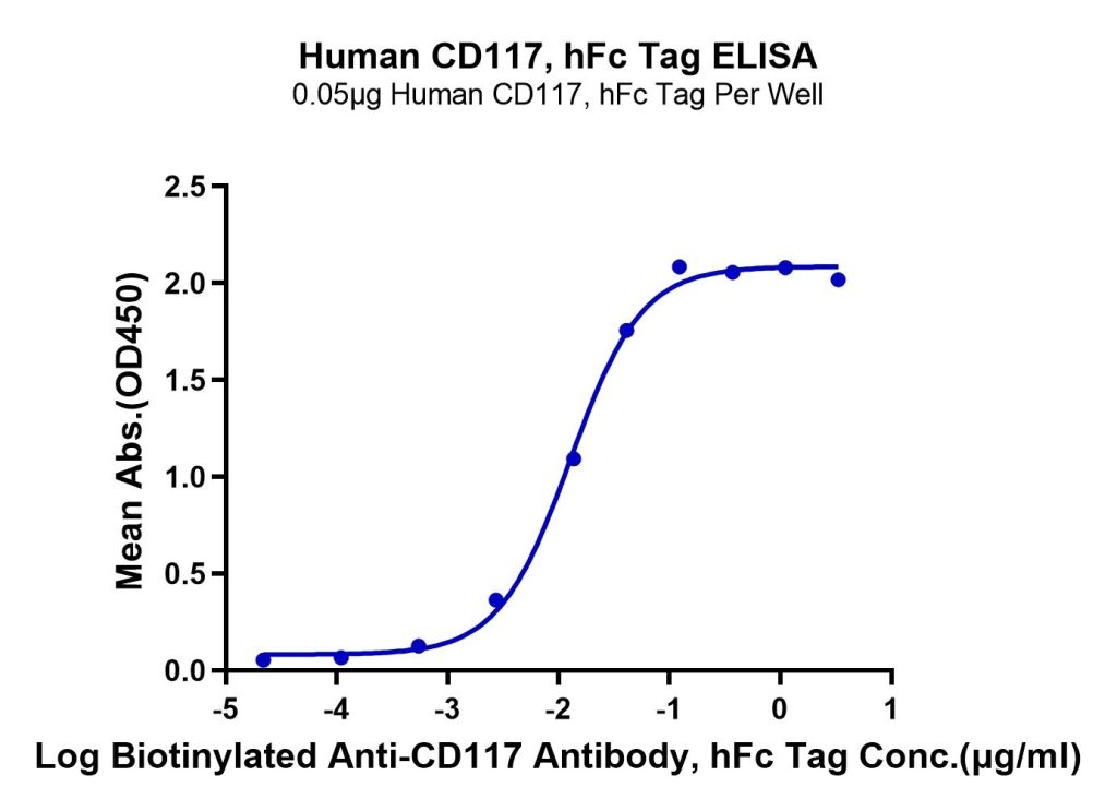 Immobilized Human CD117, hFc Tag at 0.5ug/ml (100ul/well) on the plate. Dose response curve for Biotinylated Anti-CD117 Antibody, hFc Tag with the EC50 of 12.7ng/ml determined by ELISA (QC Test). See testing image for detail.