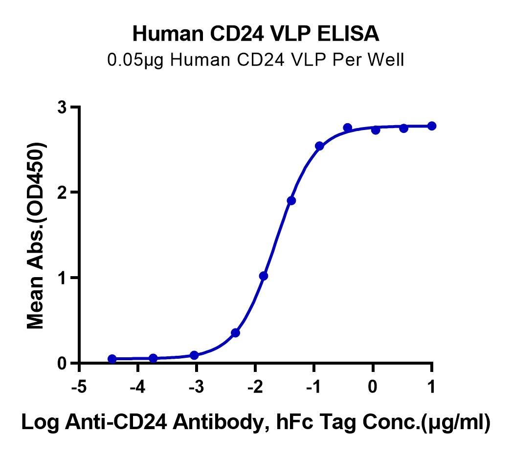 Immobilized Human CD24 VLP at 0.5ug/ml (100ul/Well) on the plate. Dose response curve for Anti-CD24 Antibody, hFc Tag with the EC50 of 22.1ng/ml determined by ELISA. See testing image for detail.
