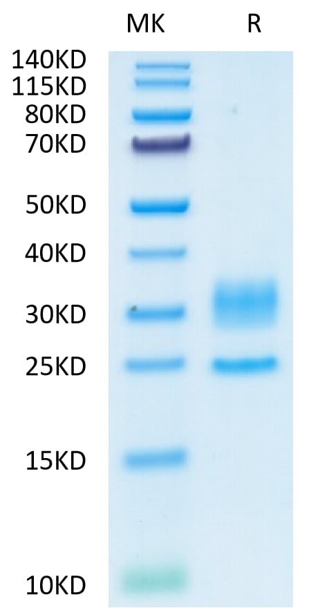 The protein has a predicted MW of 17.9 kDa (CD3E) and 16.7 kDa (CD3D). Due to glycosylation, the protein migrates to 28-38 kDa and 25 kDa based on Tris-Bis PAGE result.