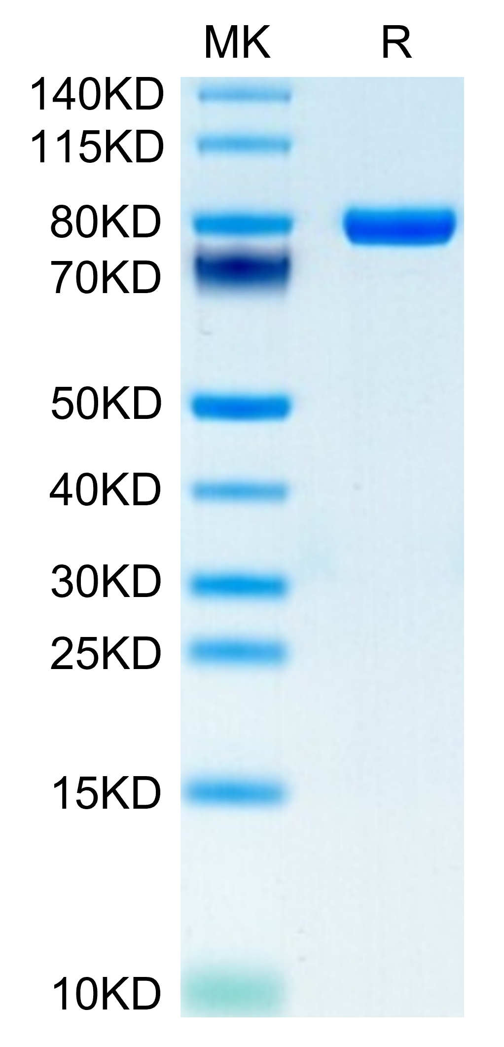 The protein has a predicted MW of 67.1 kDa. Due to glycosylation, the protein migrates to 75-82 kDa based on Tris-Bis PAGE result.