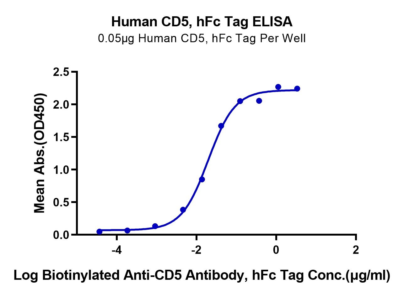 Immobilized Human CD5 at 0.5ug/ml (100ul/Well) on the plate. Dose response curve for Biotinylated Anti-CD5 Antibody, hFc Tag with the EC50 19.6ng/ml determined by ELISA. See testing image for detail.