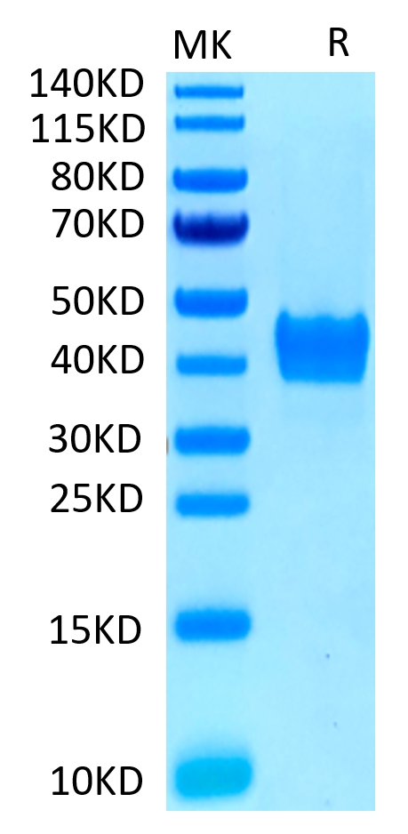 The protein has a predicted MW of 27.6 kDa. Due to glycosylation, the protein migrates to 38-48 kDa based on Tris-Bis PAGE result.