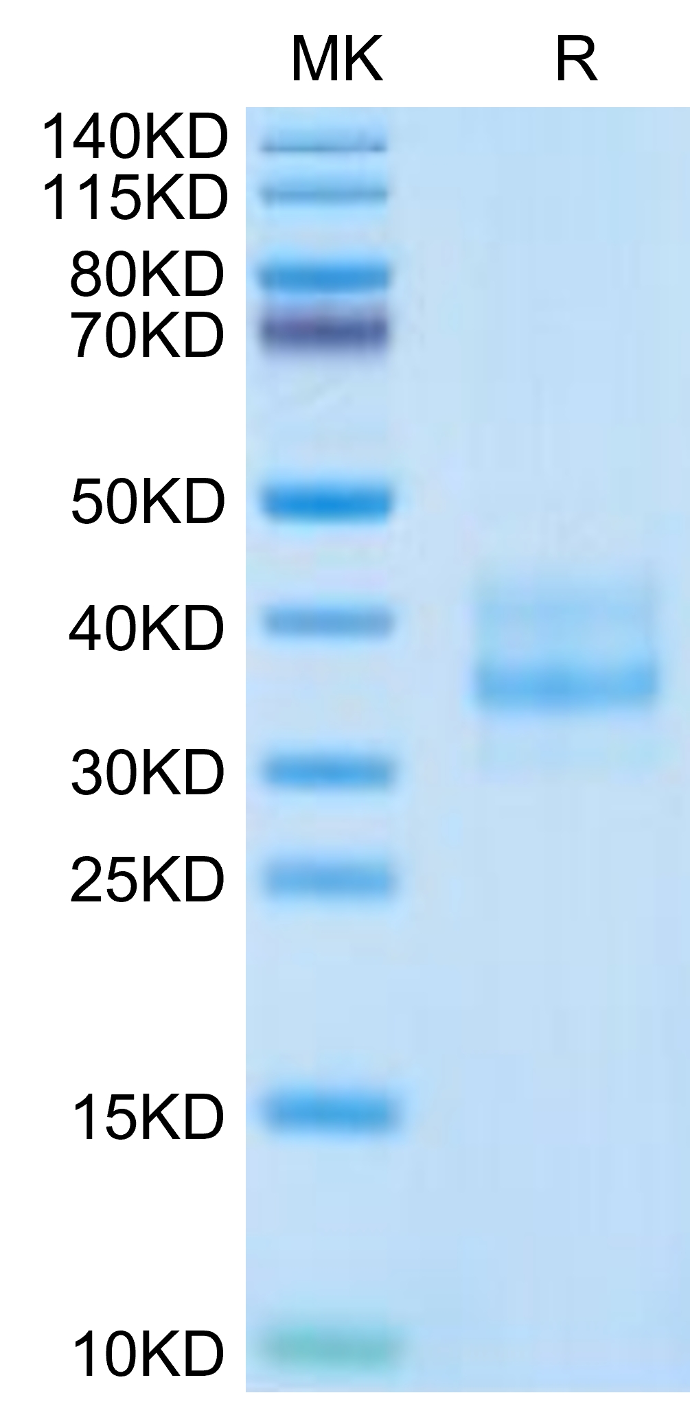 The protein has a predicted MW of 25.15 kDa. Due to glycosylation, the protein migrates to 35-45 kDa based on Tris-Bis PAGE result.