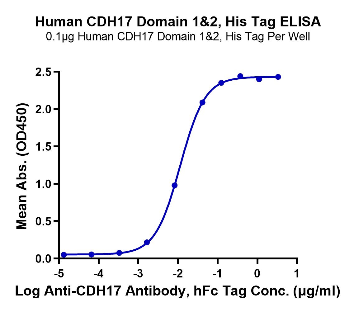 Immobilized Human CDH17 Domain 1&2, His Tag at 1ug/ml (100ul/well) on the plate. Dose response curve for Anti-CDH17 Antibody, hFc Tag with the EC50 of 11.4ng/ml determined by ELISA. See testing image for detail.