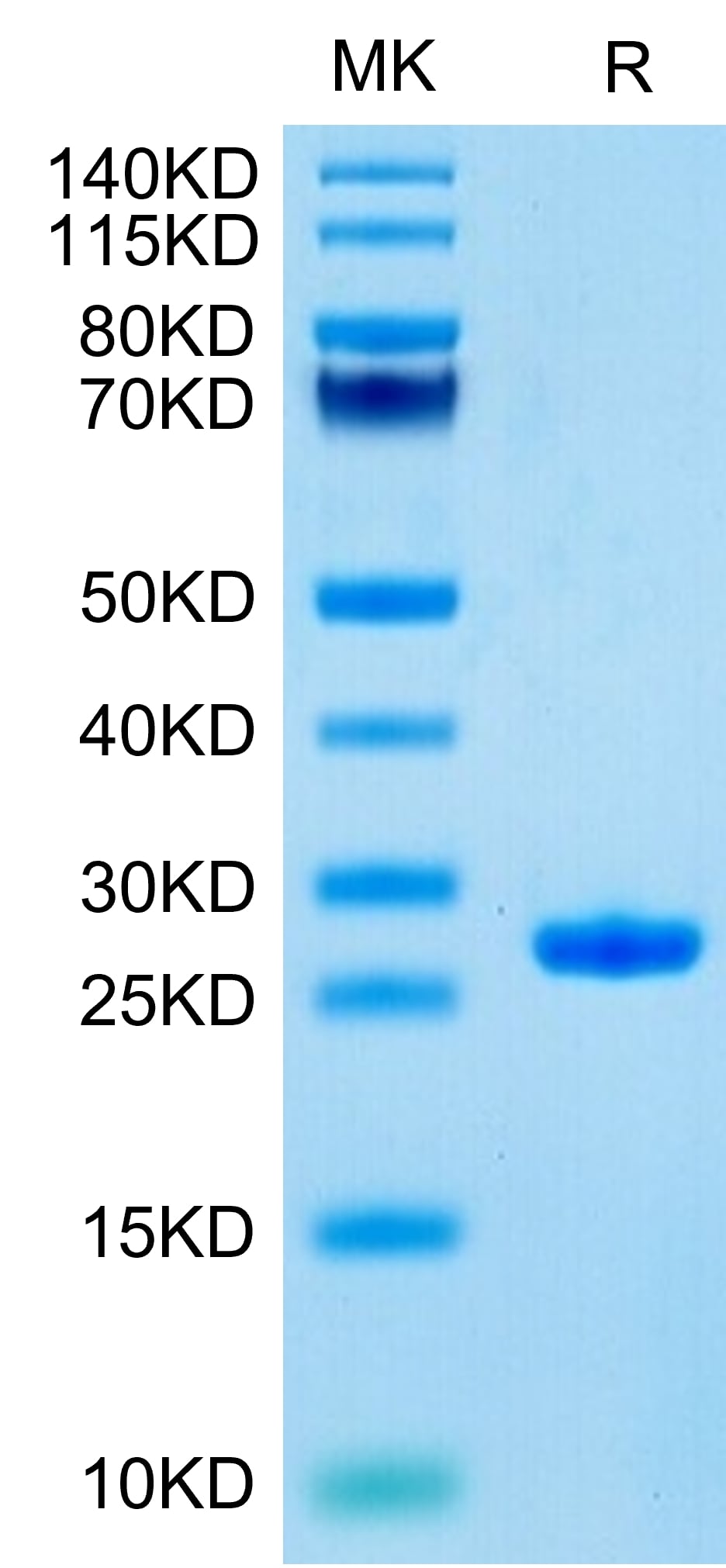 The protein has a predicted MW of 25.5 kDa. Due to glycosylation, the protein migrates to 26-27 kDa based on Tris-Bis PAGE result.