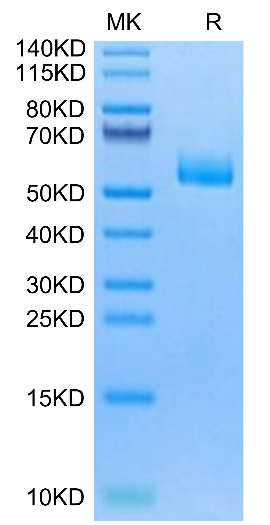 The protein has a predicted MW of 47.48 kDa. Due to glycosylation, the protein migrates to 50-65 kDa based on Tris-Bis PAGE result.