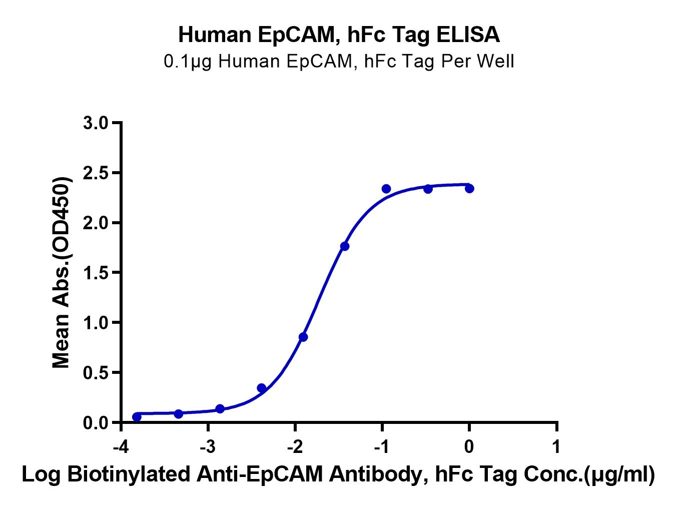 Immobilized Human EpCAM, hFc Tag at 1ug/ml (100ul/well) on the plate. Dose response curve for Biotinylated Anti-EpCAM Antibody, hFc Tag with the EC50 of 18.9ng/ml determined by ELISA. See testing image for detail.