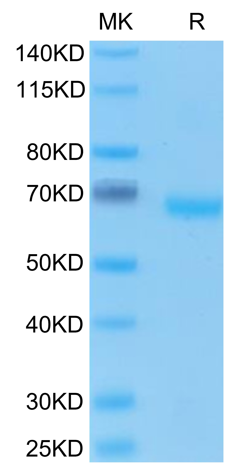 The protein has a predicted MW of 54.2 kDa. Due to glycosylation, the protein migrates to 60-70 kDa based on Tris-Bis PAGE result.