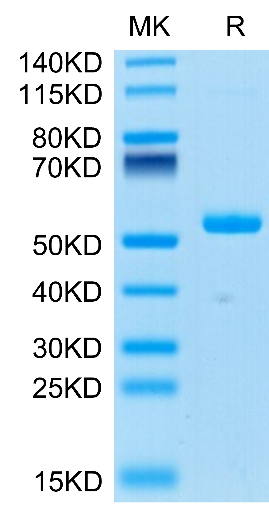 The protein has a predicted MW of 43.1 kDa. Due to glycosylation, the protein migrates to 50-60 kDa based on Tris-Bis PAGE result.