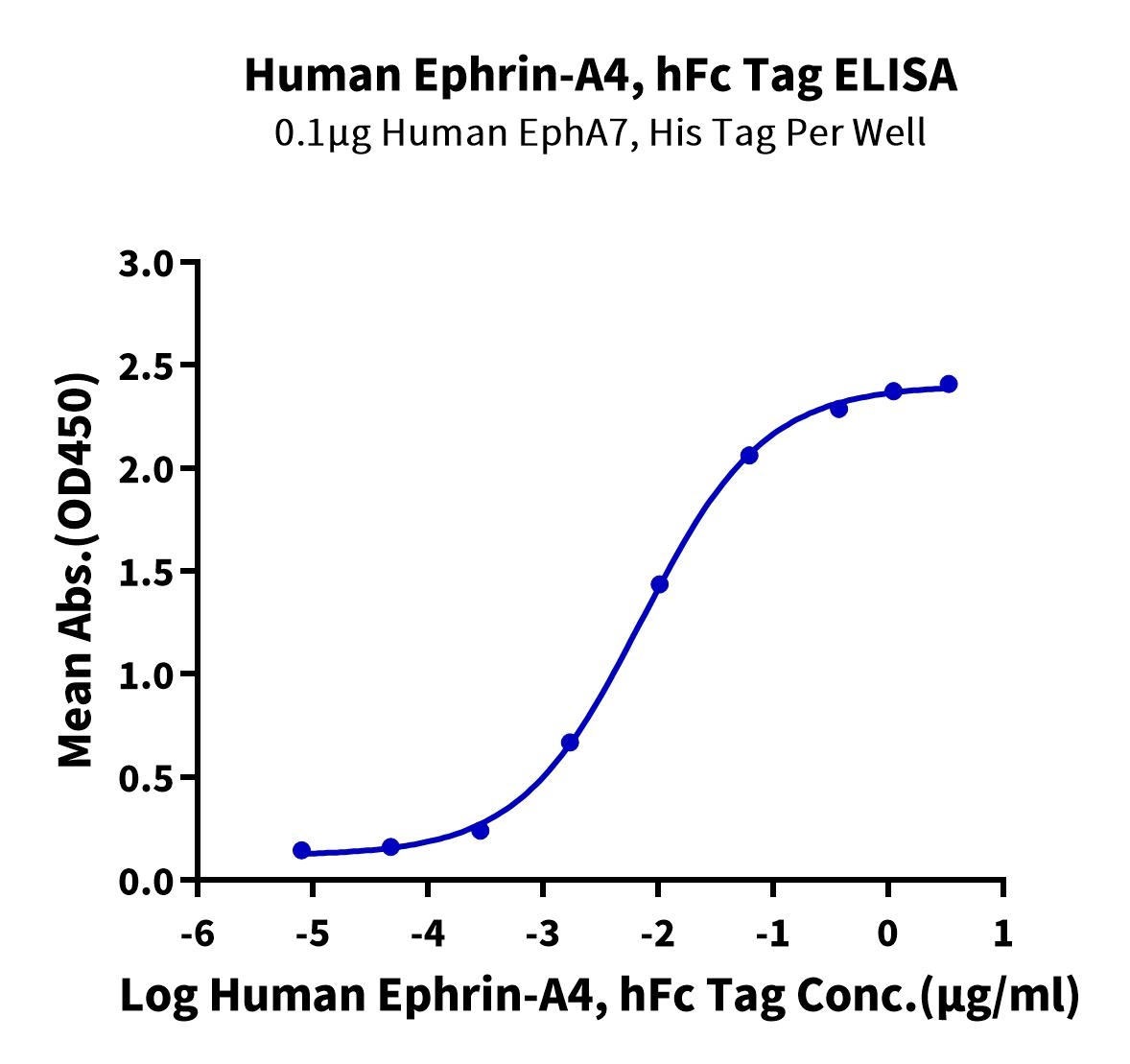 Immobilized Human EphA7, His Tag at 1ug/ml (100ul/Well) on the plate. Dose response curve for Human Ephrin-A4, hFc Tag with the EC50 of 7.8ng/ml determined by ELISA.