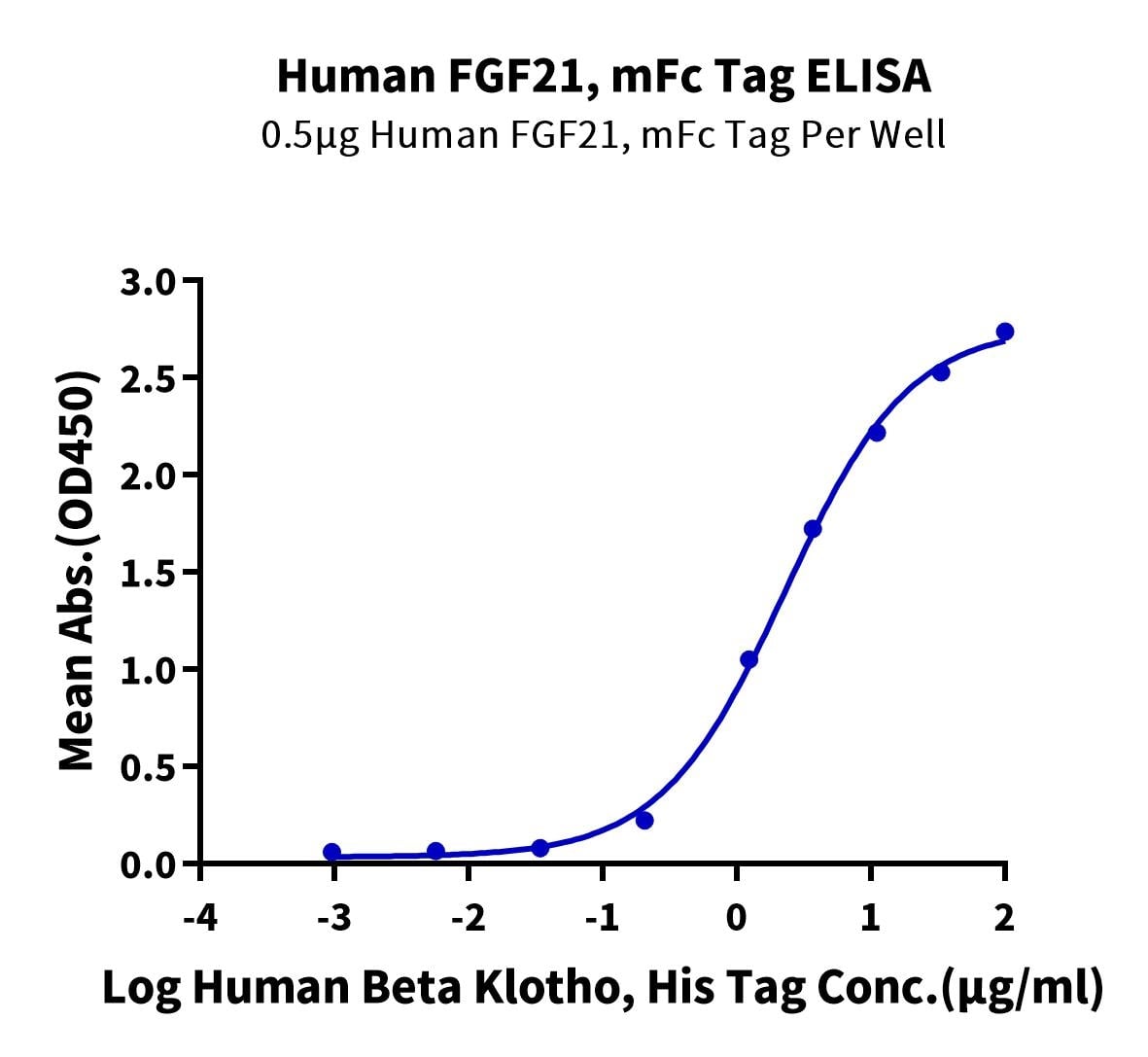 Immobilized Human FGF21 at 5ug/ml (100ul/Well) on the plate. Dose response curve for Human Beta Klotho, His Tag with the EC50 of 2.29ug/ml determined by ELISA (QC Test). The affinity constant of 0.54nM as determined in SPR assay (Biacore T200). See testing image for detail.