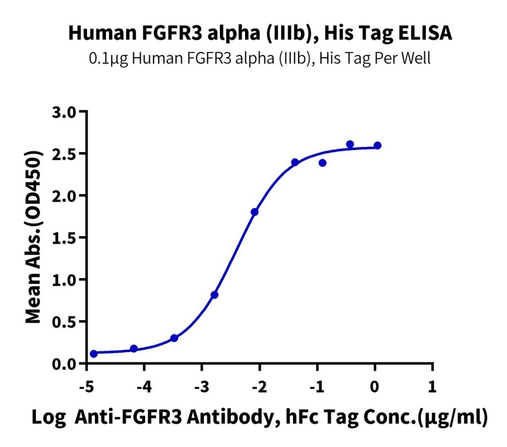 Immobilized Human FGFR3 alpha (IIIb) , His Tag at 1ug/ml (100ul/well) on the plate. Dose response curve for Anti-FGFR3 Antibody, hFc Tag with the EC50 of 4.0ng/ml determined by ELISA. See testing image for detail.