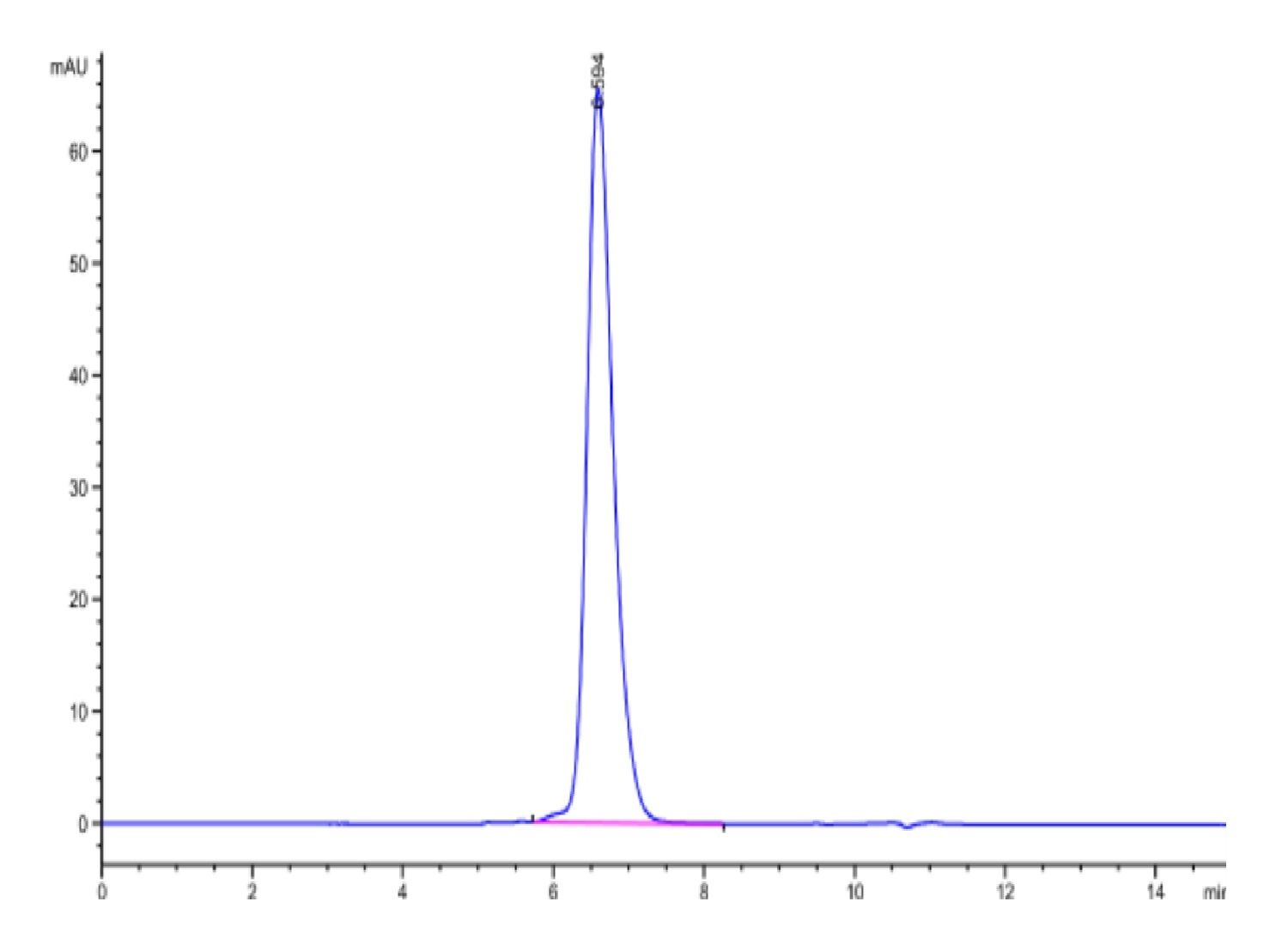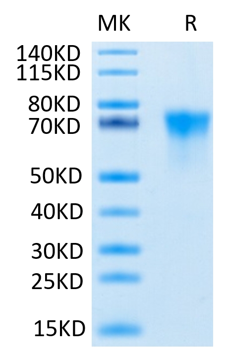 The protein has a predicted MW of 41.4 kDa. Due to glycosylation, the protein migrates to 65-75 kDa based on Tris-Bis PAGE result.