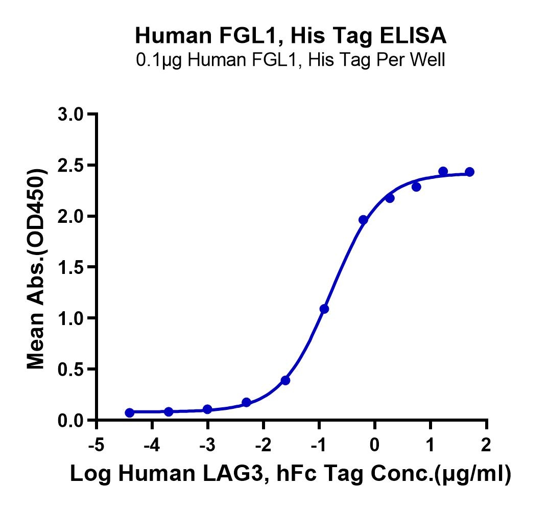 Immobilized Human FGL1, His Tag at 1ug/ml (100ul/well) on the plate. Dose response curve for Human LAG3, hFc Tag with the EC50 of 0.16ug/ml determined by ELISA. See testing image for detail.