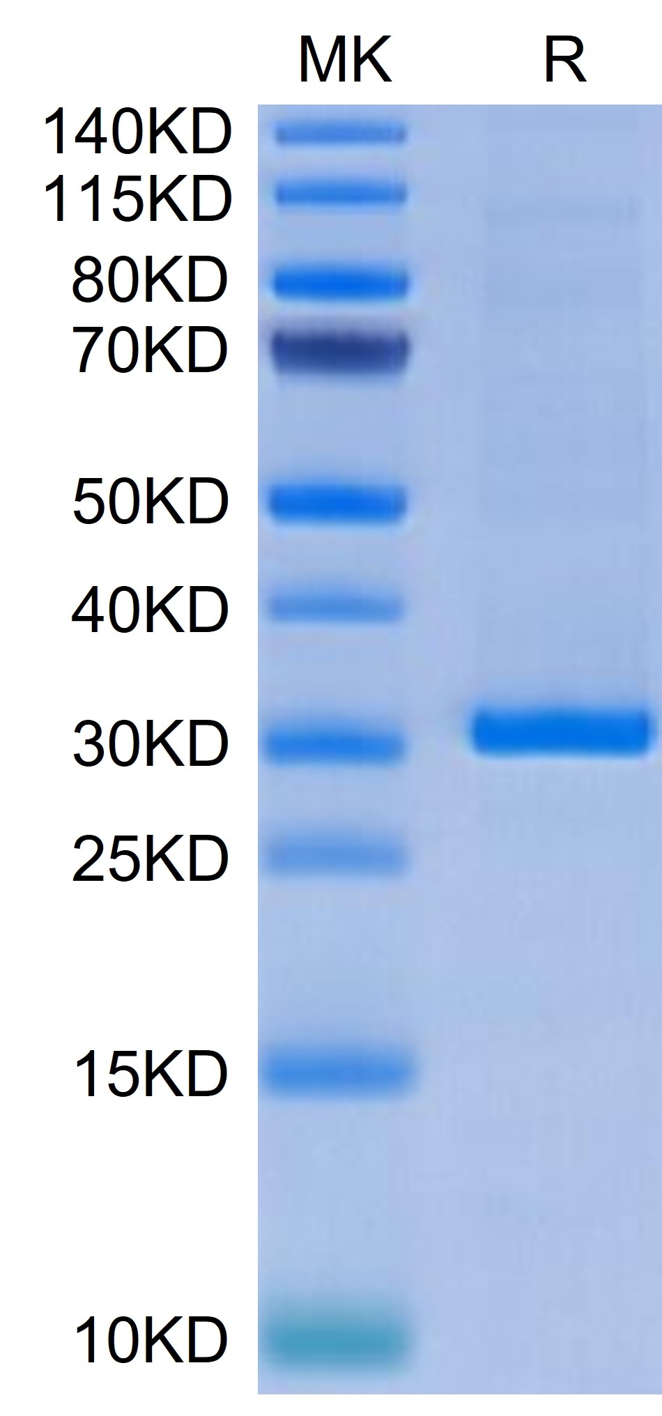 The protein has a predicted MW of 31.9 kDa same as Tris-Bis PAGE result.