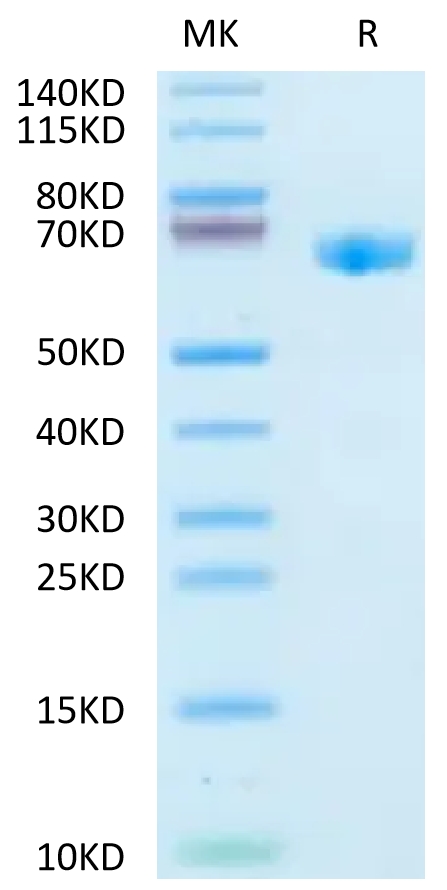 The protein has a predicted MW of 56.69 kDa. Due to glycosylation, the protein migrates to 60-70 kDa based on Tris-Bis PAGE result.