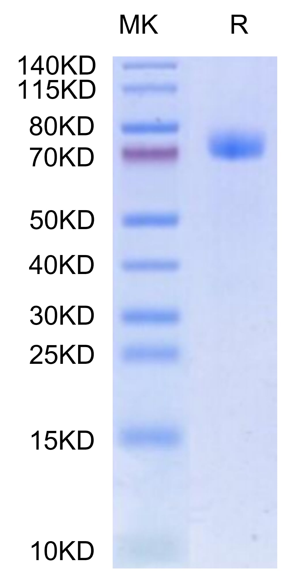 The protein has a predicted MW of 64.6 kDa. Due to glycosylation, the protein migrates to 70-80 kDa based on Tris-Bis PAGE result.