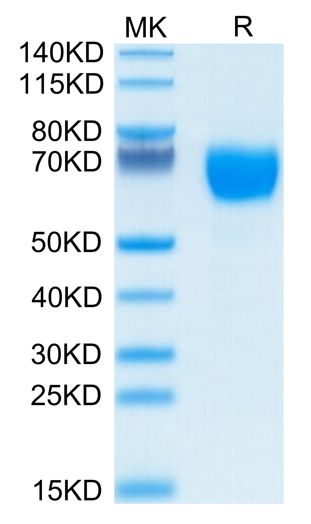 The protein has a predicted MW of 35.3 kDa. Due to glycosylation, the protein migrates to 60-70 kDa based on Tris-Bis PAGE result.