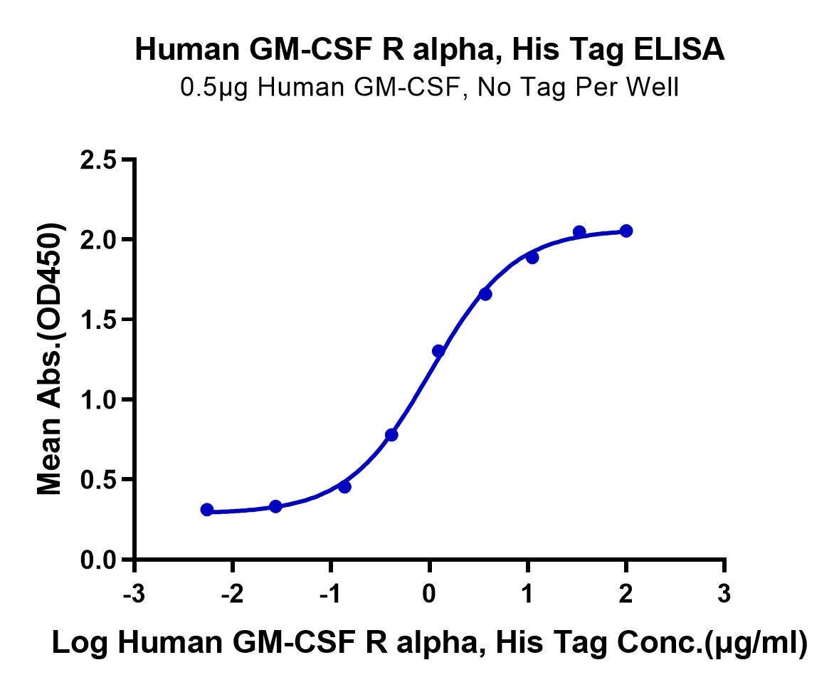 Immobilized Human GM-CSF, No Tag at 5ug/ml (100ul/Well) on the plate. Dose response curve for Human GM-CSF R alpha, His Tag with the EC50 of 1.0ug/ml determined by ELISA.