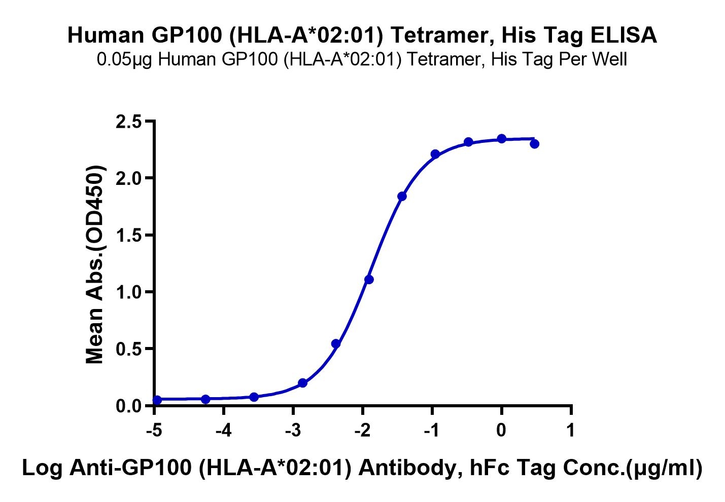 Immobilized Human GP100 (HLA-A*02:01) Tetramer, His Tag at 2ug/ml (100ul/Well) on the plate. Dose response curve for Anti-GP100 (HLA-A*02:01) Antibody, hFc Tag with the EC50 of 13.4ng/ml determined by ELISA. The affinity constant of 0.196 nM as determined in SPR assay (Biacore T200). See testing image for detail.