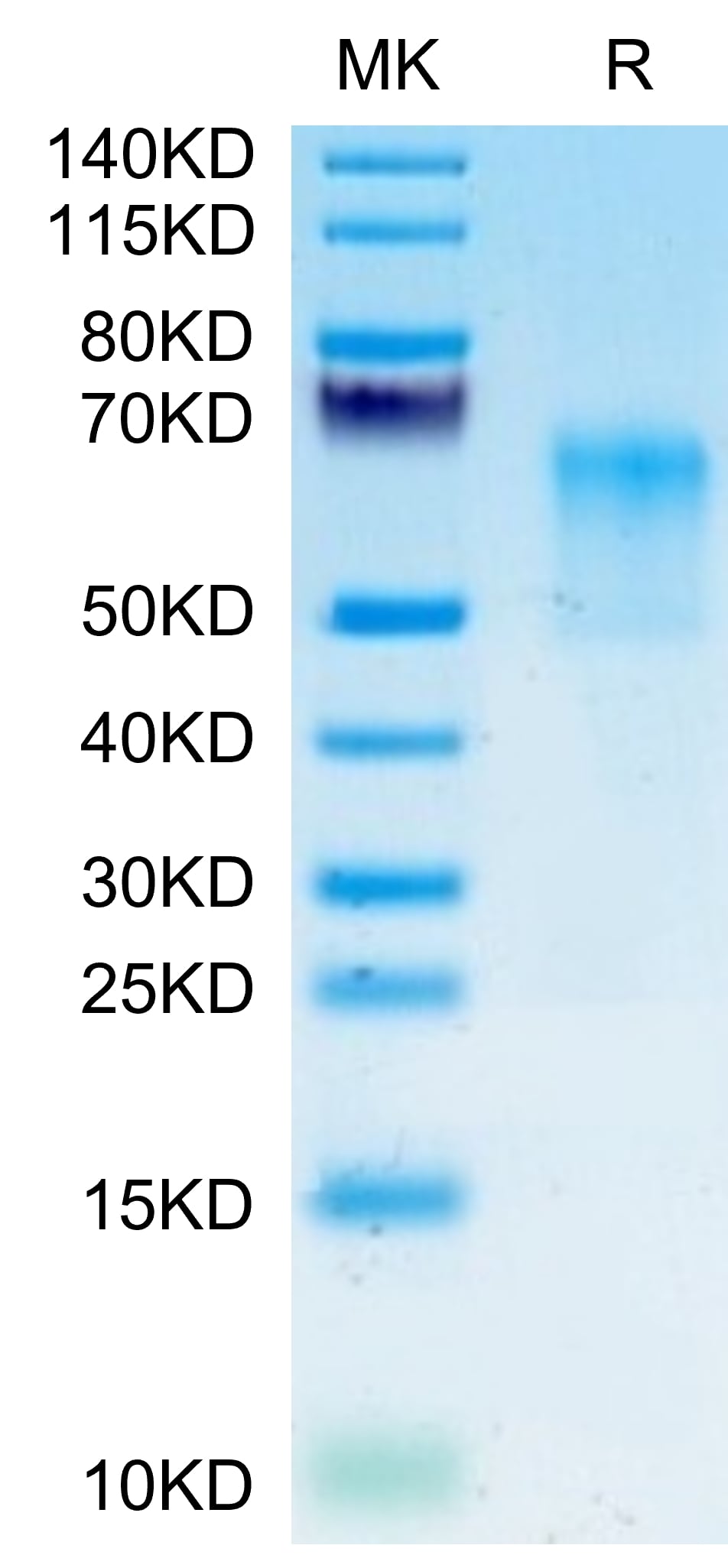 The protein has a predicted MW of 34.7 kDa. Due to glycosylation, the protein migrates to 45-70 kDa based on Tris-Bis PAGE result.
