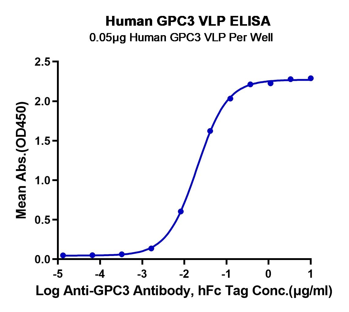 Immobilized Human GPC3 VLP at 0.5ug/ml (100ul/Well) on the plate. Dose response curve for Anti-GPC3 Antibody, hFc Tag with the EC50 of 20.2ng/ml determined by ELISA. See testing image for detail.