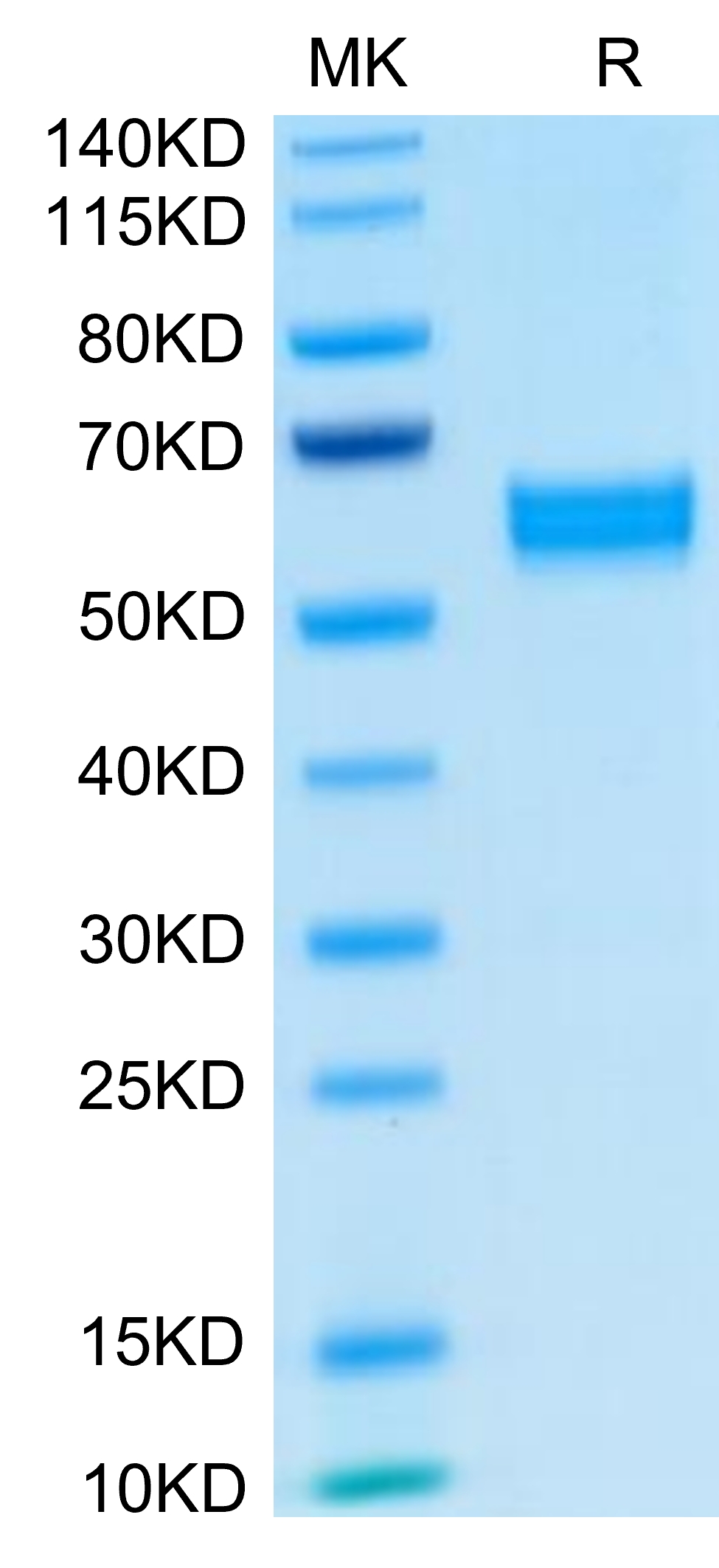 The HGF single chain can be processed into the active form of disulfide-linked heterodimer of α and β chain.The protein has a predicted MW of 79.6 kDa (after cleavage of the signal peptide). Due to glycosylation, the protein migrates to 60-65 kDa corresponding to α chain and β chain based on Bis-Tris PAGE result.