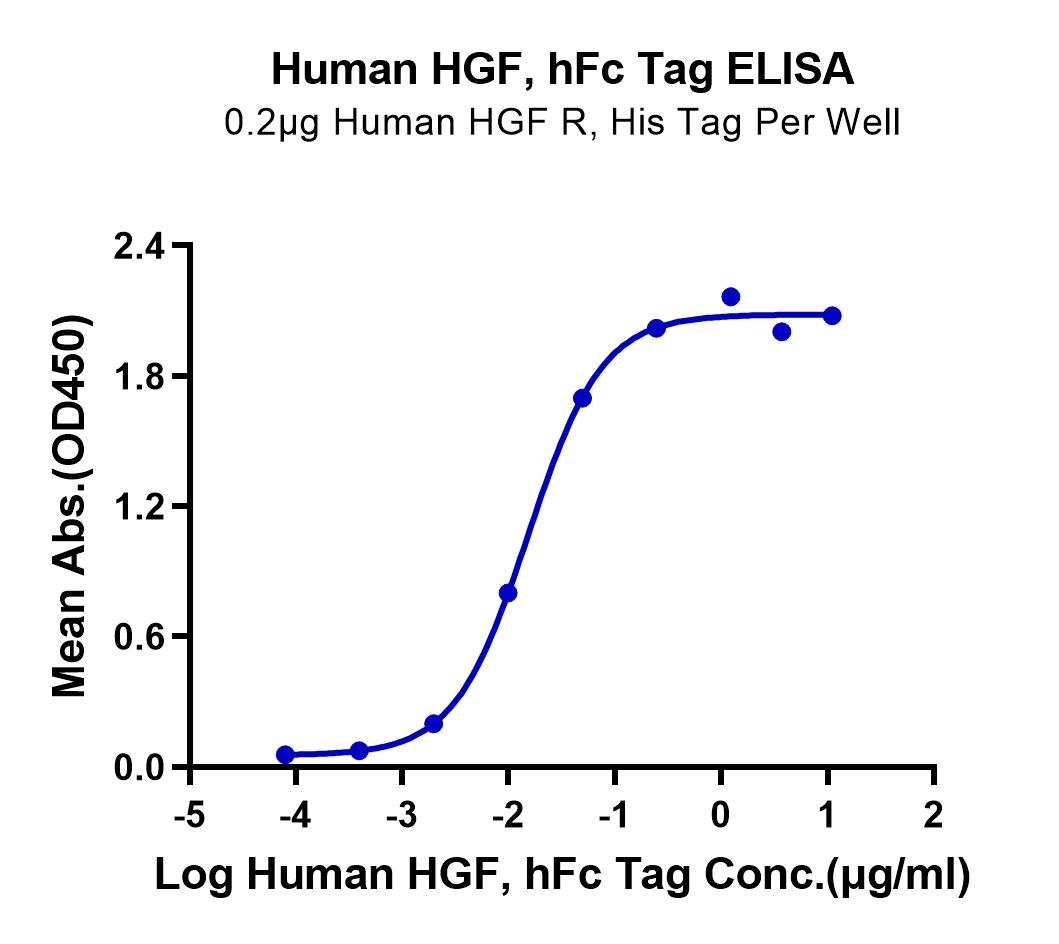 Immobilized Human HGF R, His Tag at 2μg/ml (100μl/Well) on the plate. Dose response curve for Human HGF, hFc Tag with the EC50 of 15.2ng/ml determined by ELISA. See testing image for detail.