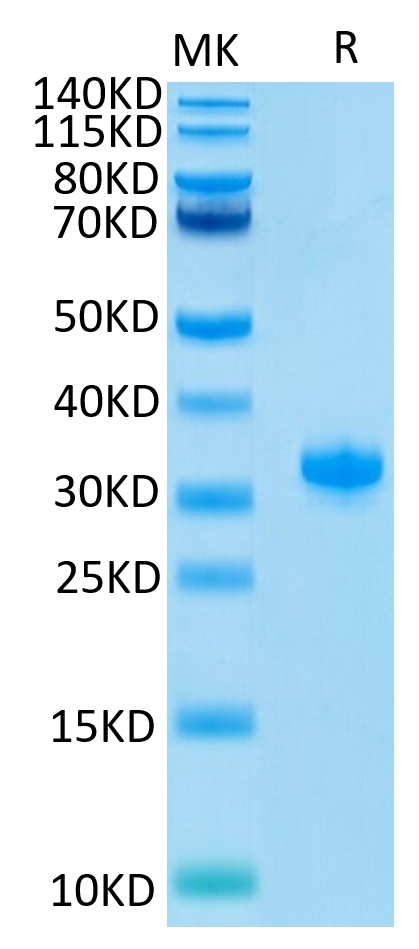 The protein has a predicted MW of 25.8 kDa. Due to glycosylation, the protein migrates to 30-35 kDa based on Tris-Bis PAGE result.