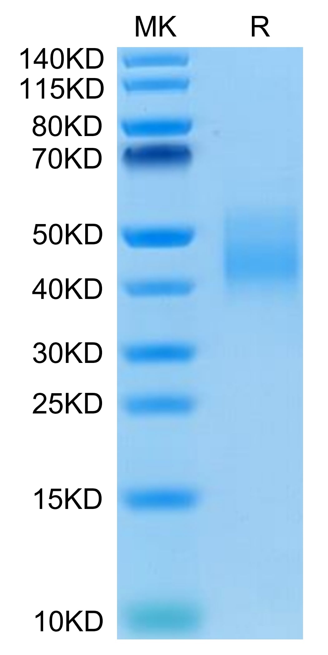The protein has a predicted MW of 27 kDa. Due to glycosylation, the protein migrates to 40-48 kDa based on Tris-Bis PAGE result.