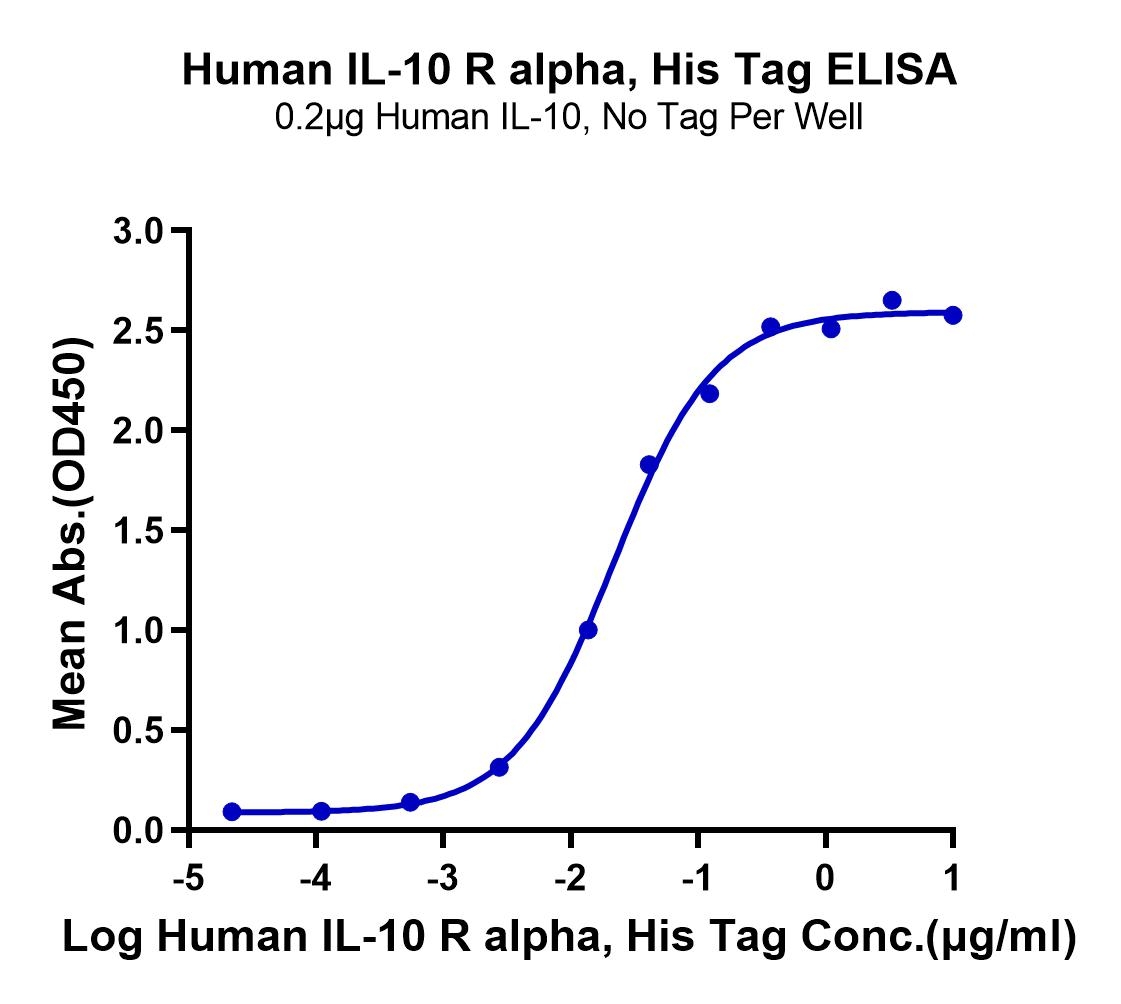 Immobilized Human IL-10, No Tag at 2ug/ml (100ul/well) on the plate. Dose response curve for Human IL-10 R alpha, His Tag with the EC50 of 21.8ng/ml determined by ELISA (QC Test). The affinity constant of 0.13 nM as determined in SPR assay (Biacore T200). See testing image for detail.