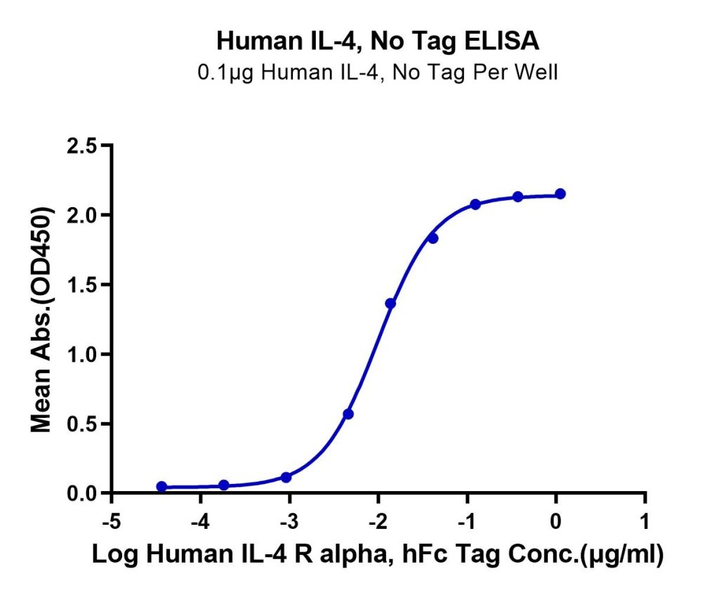 Immobilized Human IL-4, No Tag at 1ug/ml (100ul/well) on the plate. Dose response curve for Human IL-4 R alpha, hFc Tag with the EC50 of 9.8ng/ml determined by ELISA. See testing image for detail.