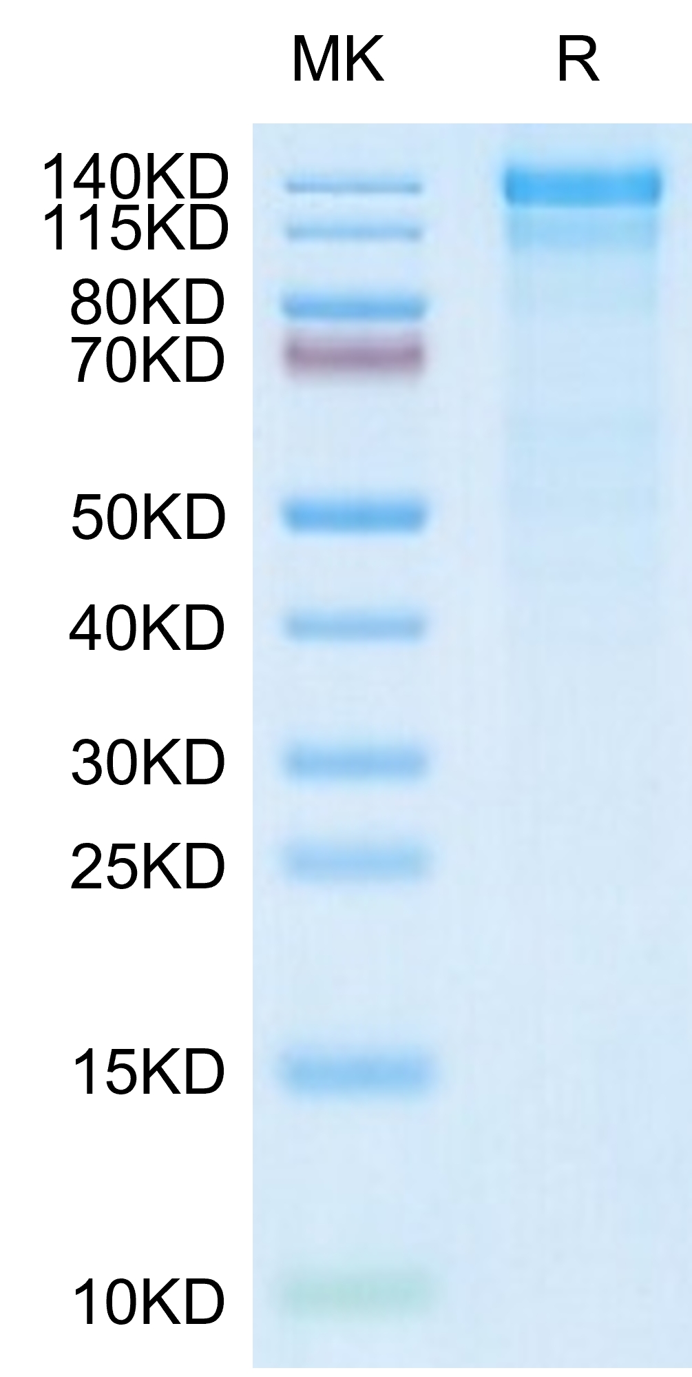 The protein has a predicted MW of 125.60 kDa (ITGA10) & 83.2 kDa (ITGB1). Due to glycosylation, the protein migrates to 140-160 kDa (ITGA10) and 100-130 kDa (ITGB1) based on Tris-Bis PAGE result.