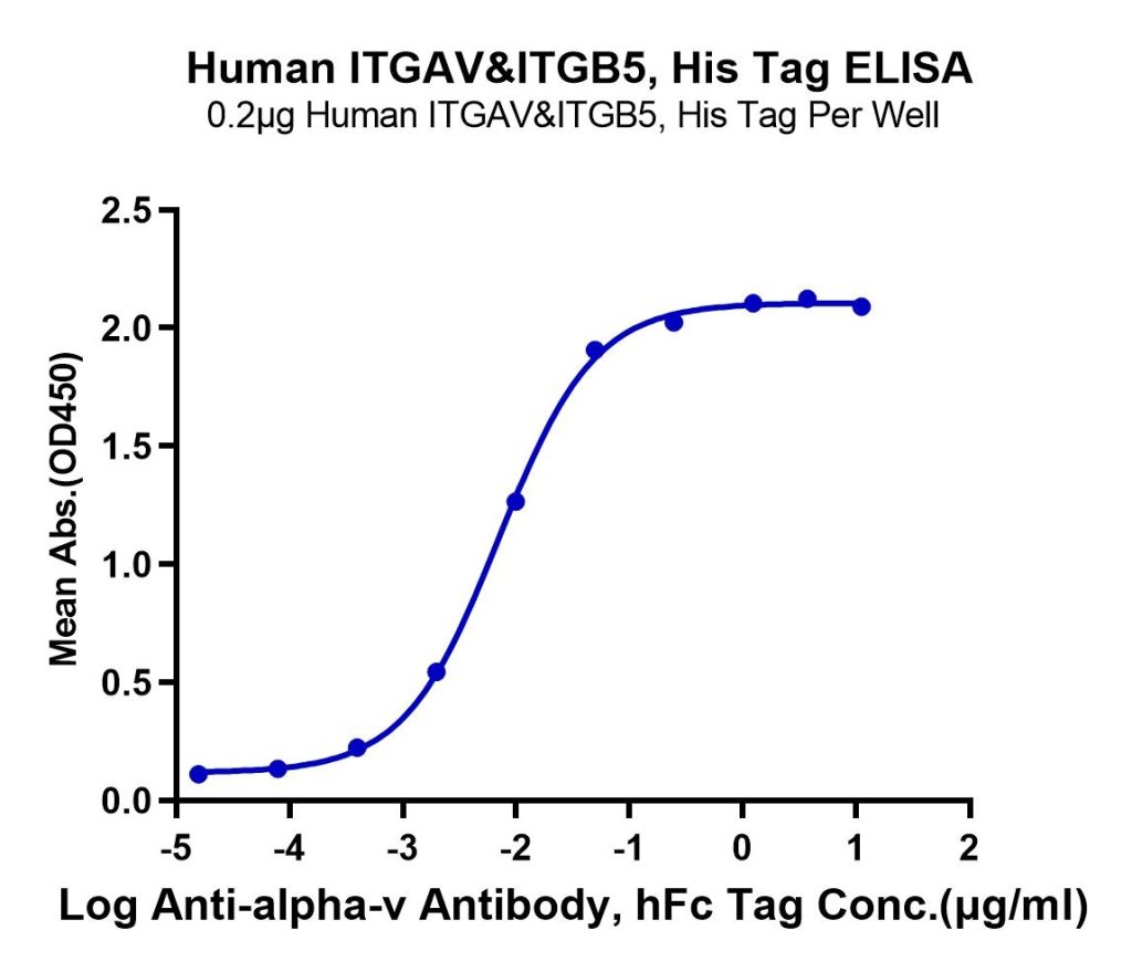 Immobilized Human ITGAV&ITGB5, His Tag at 2ug/ml (100ul/Well) on the plate. Dose response curve for Anti-alpha V Antibody, hFc Tag with the EC50 of 7.1ng/ml determined by ELISA. See testing image for detail.