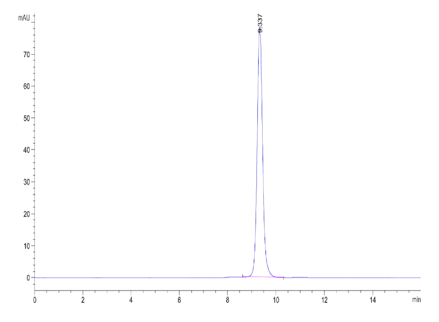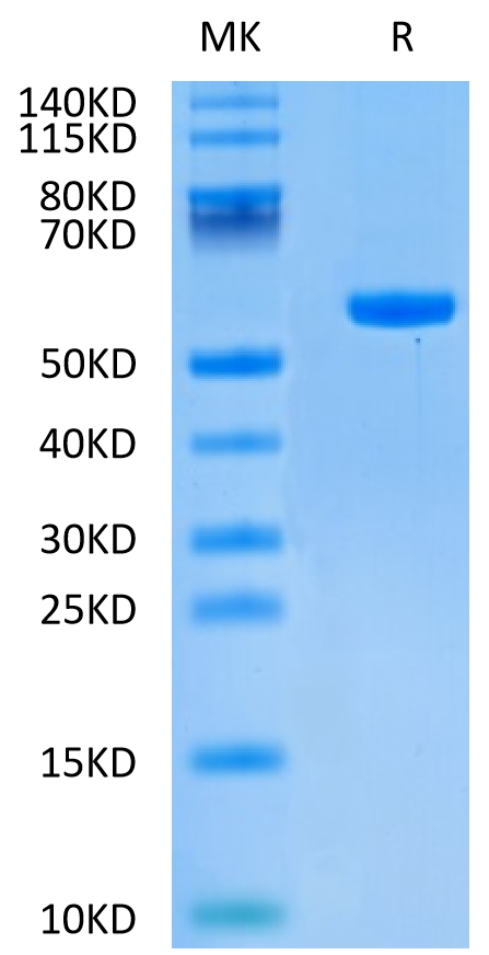 The protein has a predicted MW of 50.30 kDa. Due to glycosylation, the protein migrates to 55-65 kDa based on Tris-Bis PAGE result.