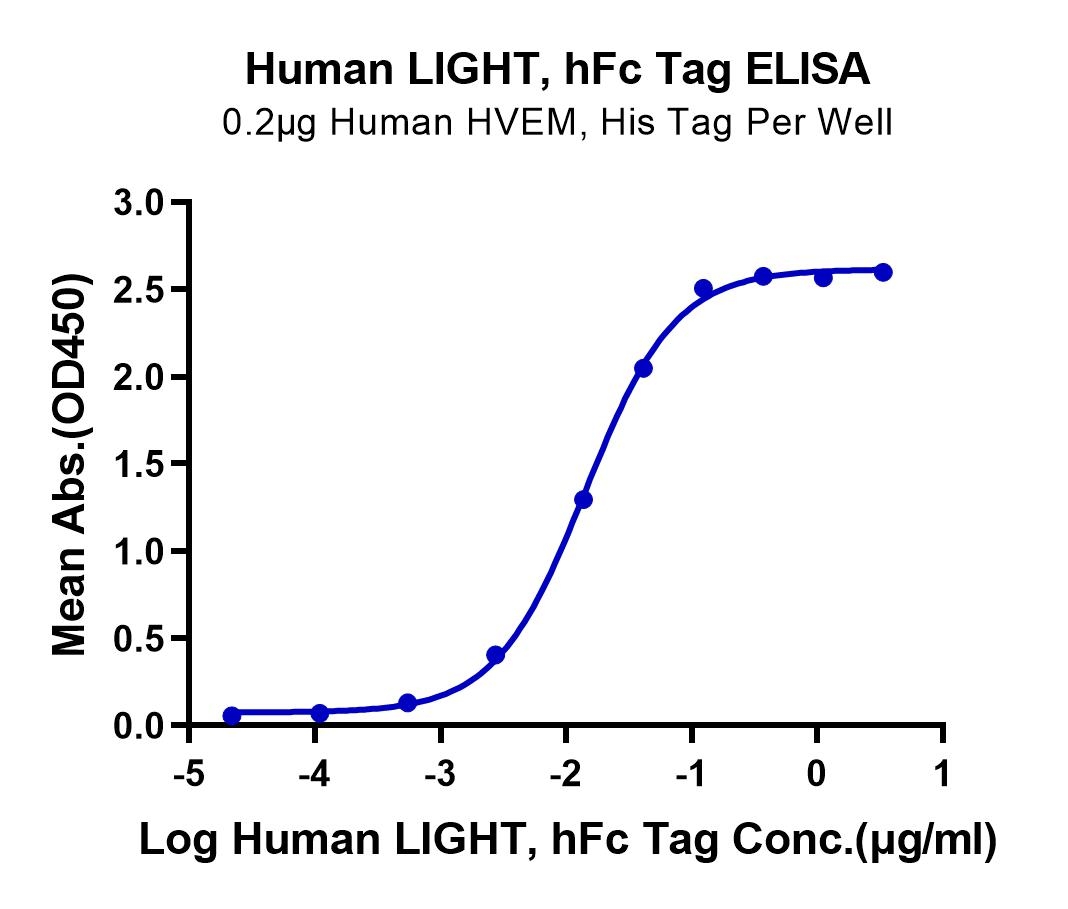 Immobilized Human HVEM, His Tag at 1ug/ml (100ul/Well) on the plate. Dose response curve for Human LIGHT, hFc Tag with the EC50 of 14.2ng/ml determined by ELISA. See testing image for detail.