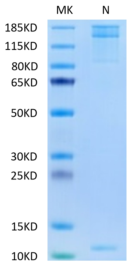 The protein has a predicted MW of 258 kDa. The protein migrates to 160-250 kDa (HLA-A*02:01&streptavidin tetramer) and 11.9 kDa (B2M) based on Tris-Bis PAGE result under Non reducing (N) condition.