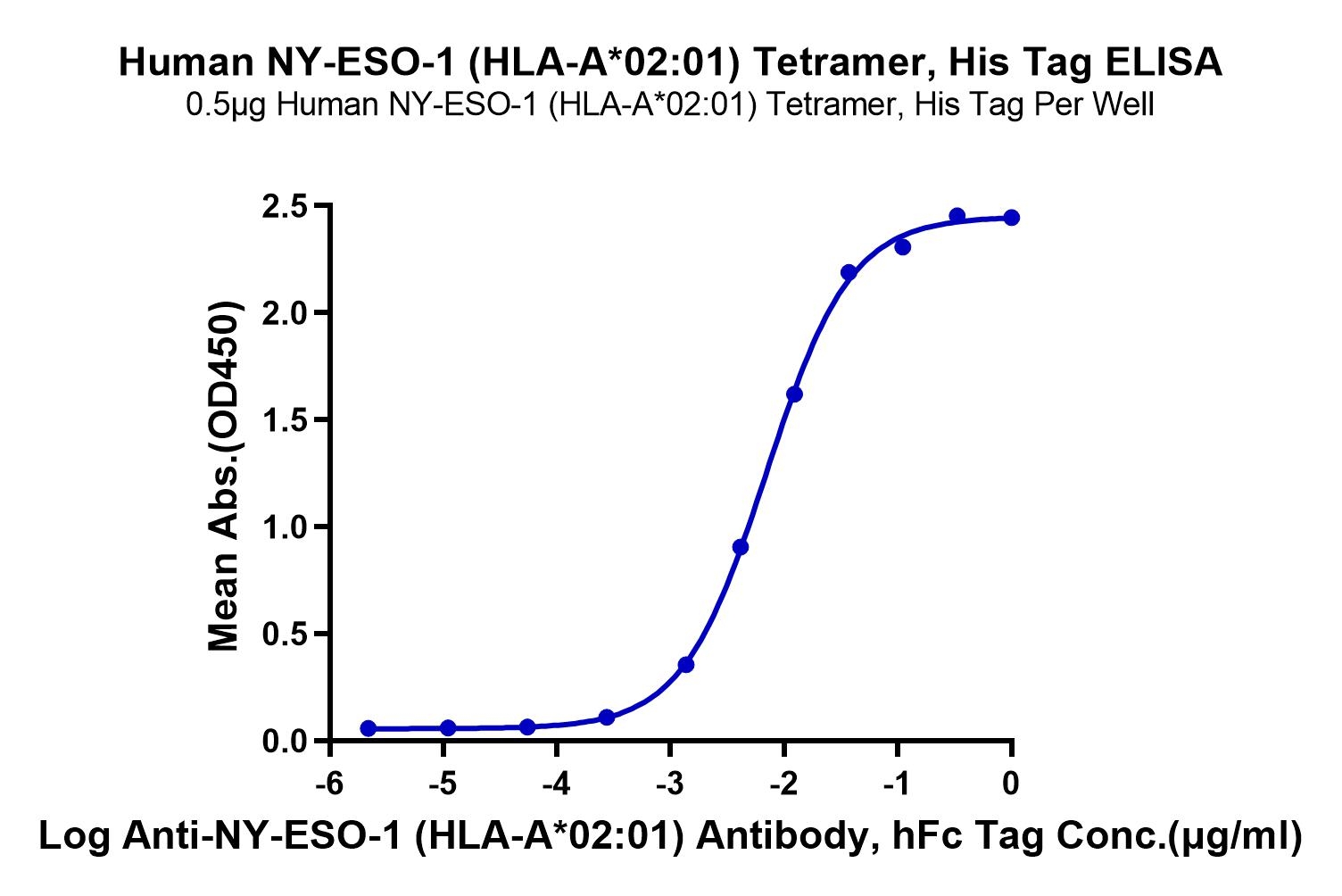 Immobilized Human NY-ESO-1 (HLA-A*02:01) Tetramer, His Tag at 5μg/ml (100μl/well) on the plate. Dose response curve for Anti-NY-ESO-1 (HLA-A*02:01) Antibody, hFc Tag with the EC50 of 7.0ng/ml determined by ELISA. See testing image for detail.