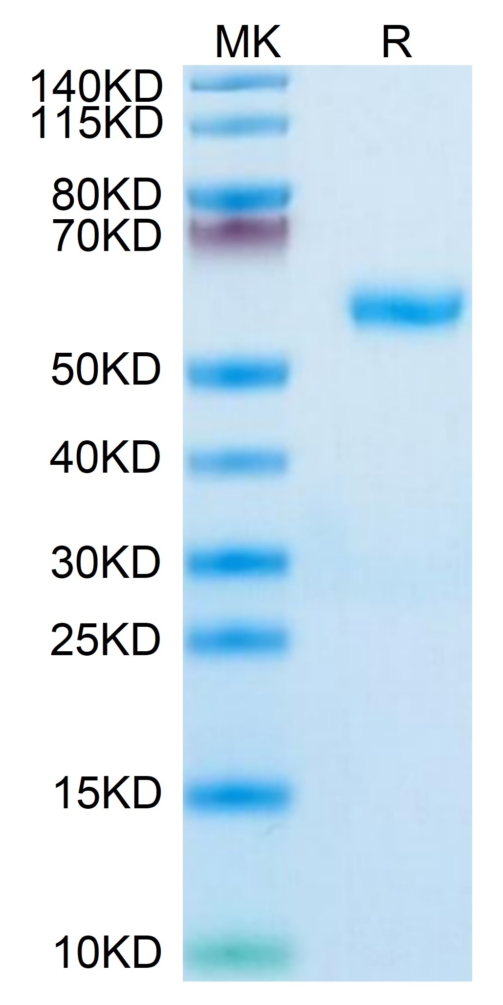 The protein has a predicted MW of 45.8 kDa. Due to glycosylation, the protein migrates to 55-60 kDa based on Tris-Bis PAGE result.