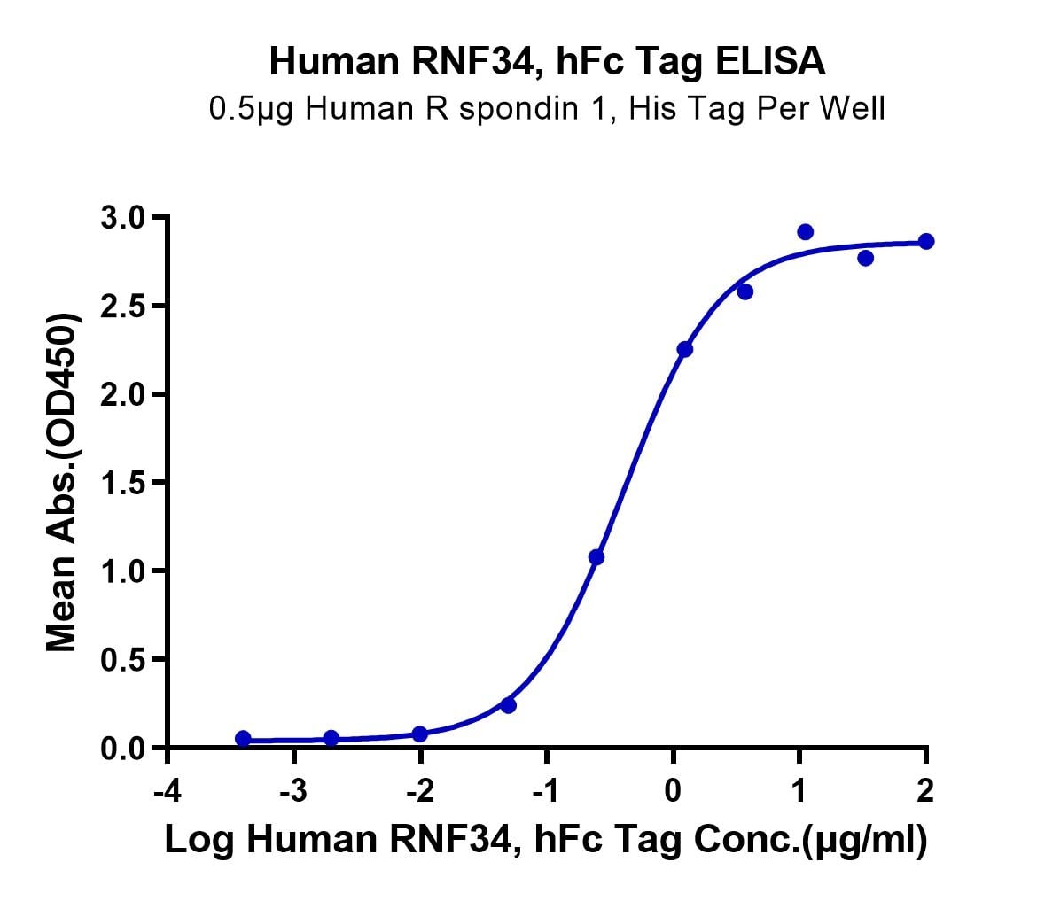Immobilized Human R spondin 1, His Tag at 5ug/ml (100ul/well) on the plate. Dose response curve for Human RNF34, hFc Tag with the EC50 of 0.4ug/ml determined by ELISA.