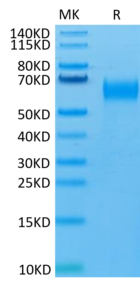 The protein has a predicted MW of 39.9 kDa. Due to glycosylation, the protein migrates to 60-70 kDa based on Tris-Bis PAGE result.
