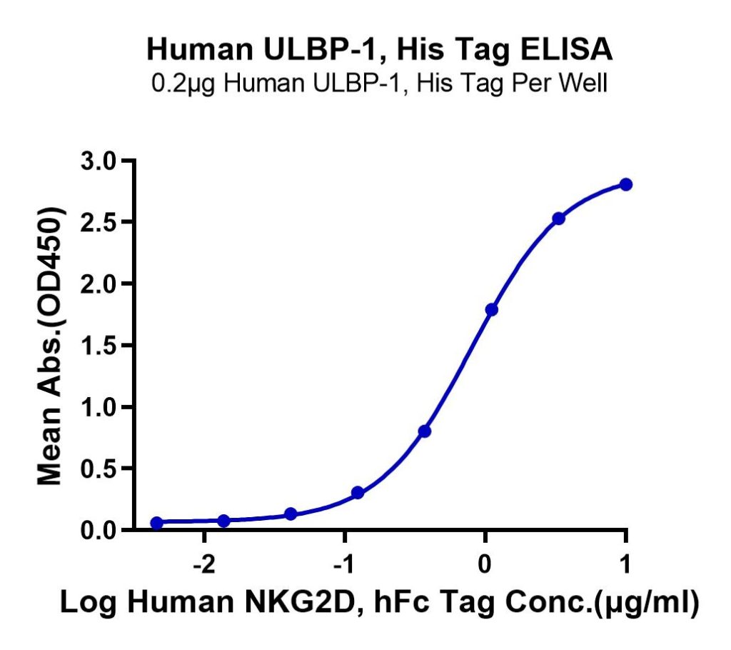 Immobilized Human ULBP-1, His Tag at 2ug/ml (100ul/well) on the plate. Dose response curve for Human NKG2D, hFc Tag with the EC50 of 0.81ug/ml determined by ELISA. See testing image for detail.