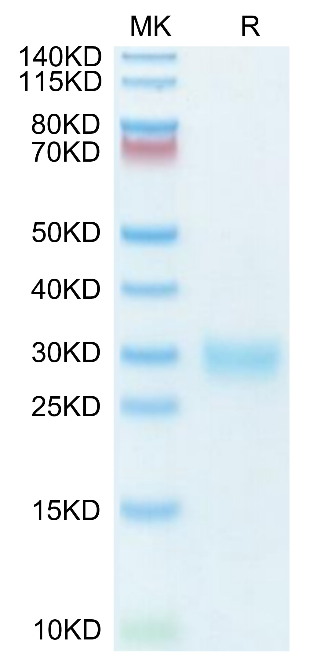 The protein has a predicted MW of 25.2 kDa. Due to glycosylation, the protein migrates to 28-35 kDa based on Tris-Bis PAGE result.