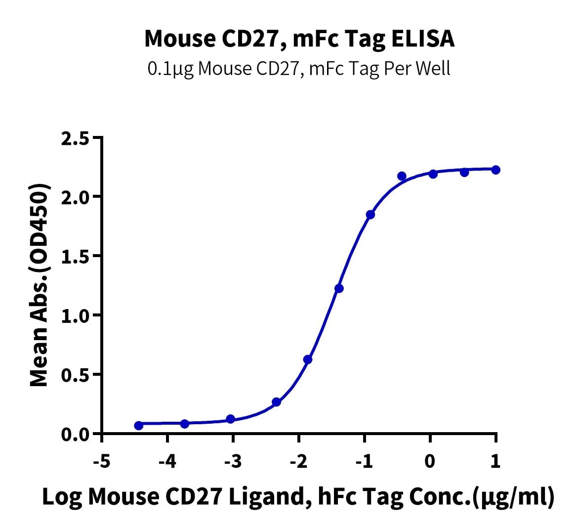 Immobilized Mouse CD27, mFc Tag at 1ug/ml (100ul/Well) on the plate. Dose response curve for Mouse CD27 Ligand, hFc Tag with the EC50 of 35.5ng/ml determined by ELISA. See testing image for detail.