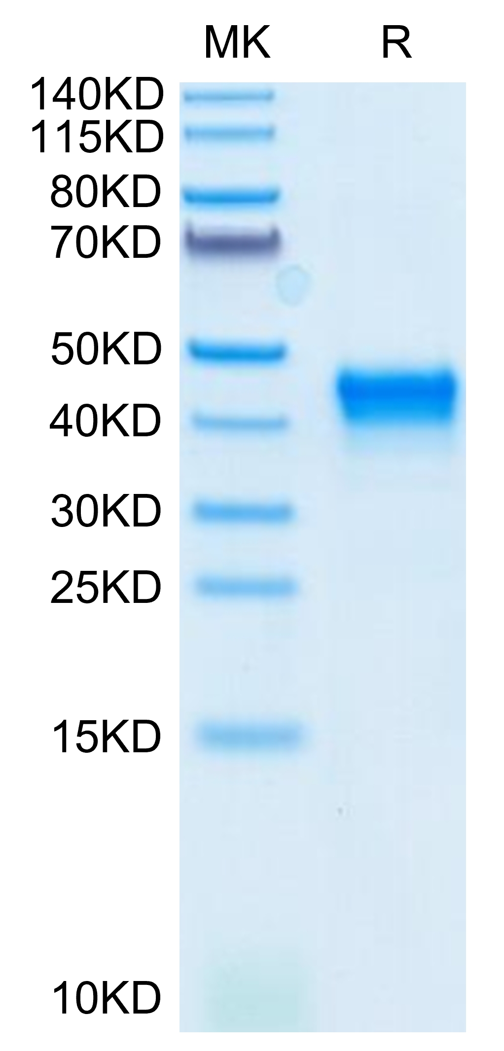 The protein has a predicted MW of 30.9 kDa. Due to glycosylation, the protein migrates to 40-50 kDa based on Tris-Bis PAGE result.