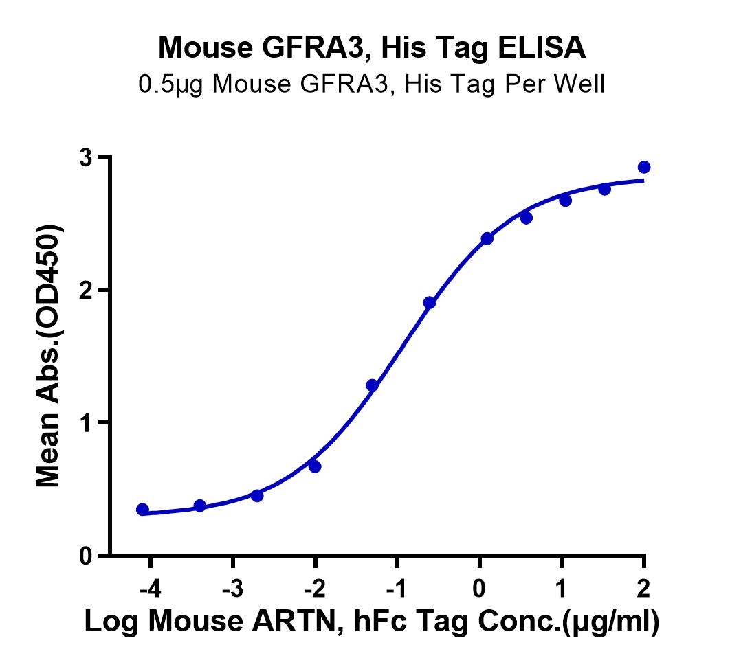 Immobilized Mouse GFRA3, His Tag at 5ug/ml (100ul/Well) on the plate. Dose response curve for Mouse ARTN, hFc Tag with the EC50 of 0.12ug/ml determined by ELISA. See testing image for detail.